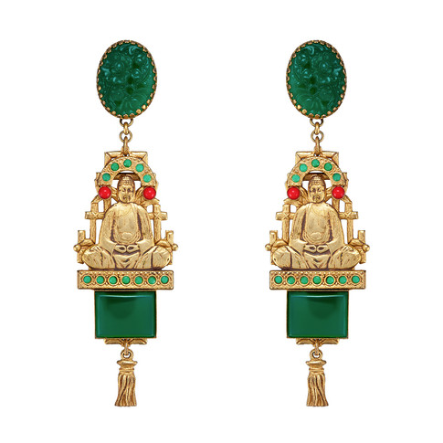 Над одними из таких изделий в свое время работали мастера Askew London. Созданная вручную коллекция Buddha имеет антикварную позолоченную отделку с великолепными кабошонами из цветного художественного стекла зеленого цвета, а также бусины и кристальные стразы. Каждая составляющая линейки обладает главной деталью – небольшой фигурой медитирующего Будды.